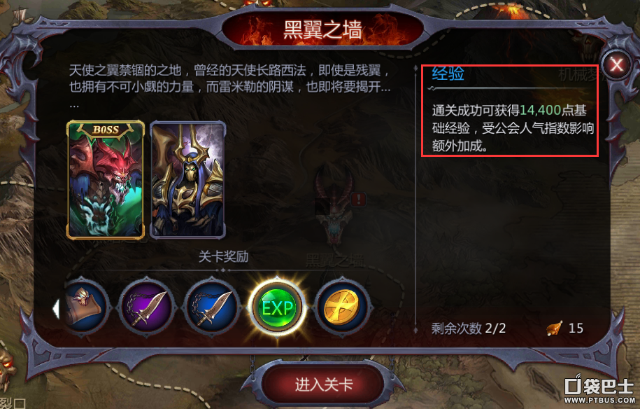 黑暗之门是游戏中另一个经验副本。开启黑暗之门后,玩家点击翻牌可随机触发特殊事件获得经验奖励的加成。通过攻打黑暗之门中的副本,可获得大量的经验奖励。PS:黑暗之门是可以使用扫荡卷的哟~