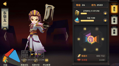 东皇太一人物属性中的魂(决定法术攻击力)、 体(决定生命值)、 敏(决定暴击能力) 数值比较高,念(决定治疗能力)数值一般,总体属性偏向走暴击的法功输出类型。生命值不低,技能有辅助治疗能力。