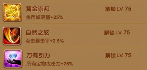 另外,需要注意的是,所有的宝物,在升到75级左右的时候,会解锁特有技能!如上图的黄金崇拜、自然之怒、万有引力!