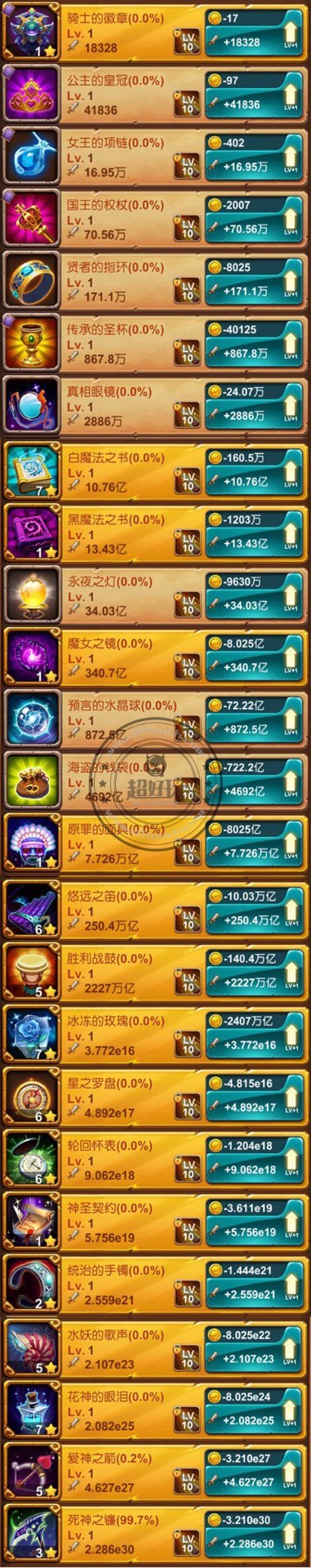 个人的玩法建议是,在推图的过程之中,只需要主要升级三个宝物!由于靠后的宝物升级性价比较高,所以我都是升级最后三个宝物——花神的眼泪、爱神之箭、死神之镰!