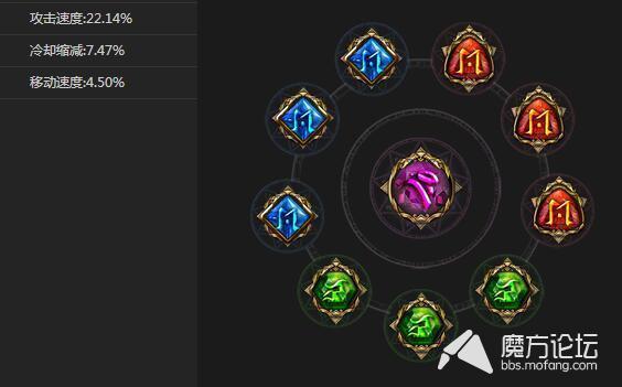 攻速在开头就说过对墨菲托斯很重要,因此红色和蓝色石头都选择的是攻速,至于绿色石头,原本是想选择护甲法防的,但是想想这点防御值还不如装备的加成高,所以就换成减CD的圣石了,同时紫色石头选择是移动速度,来提高墨菲托斯的灵活性,方便他能够更好的对线。