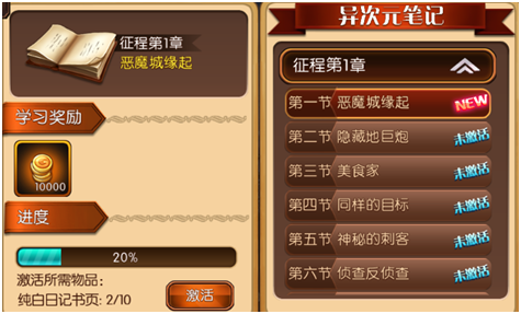 通过征程通关副本就有可能获得各种颜色的日记书页,收集达到一定数量就可以激活异次元笔记,来获得金币奖励。