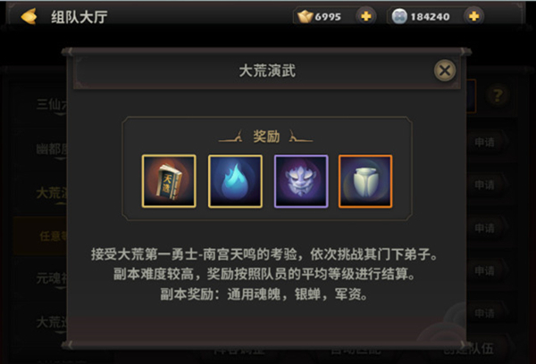 大荒演武共分8个环节,需要3名玩家组队开启。副本奖励天选者经验、银蝉、通用魂魄、军资。