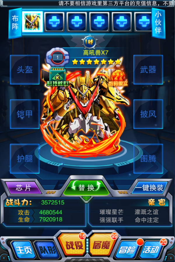 《究极数码世界》新增科技核心系统玩法,只要对科技核心进行升级(上阵所有数码兽使用同一个科技核心),就可以提升所有6只宝宝的属性。真是一人得道,鸡犬升天啊。(pia,pia 跑走!)