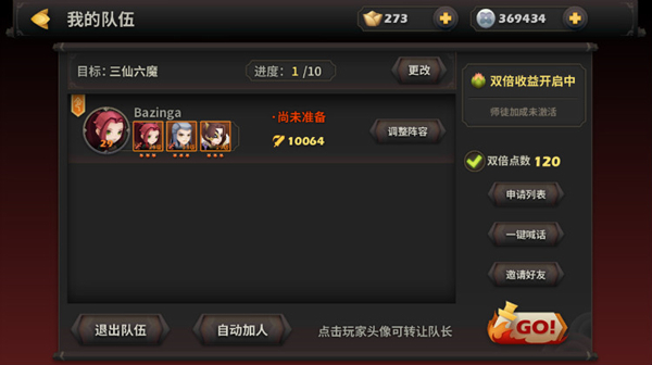开启条件:三人组队开启。注意一定要点双倍点数,开启双倍收益。(双倍点数每周六更新180点,每次三仙六魔任务消耗2点。)