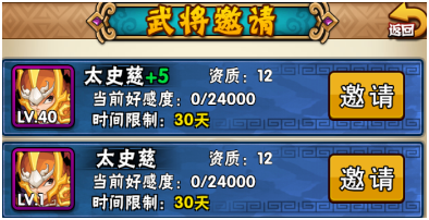 1、每个武将都是有好感度时限的,当时限归零时,武将的好感度会被清空,回到邀请列表,所以建议当你邀请了一个武将后,专盯着一个武将培养好感度。