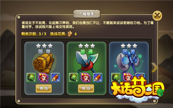 进入本本后主公会发现只能挑战简单难度的本本,因为普通和困难需要主公等级到达35和45级才能开放;每个本本每天都有三次挑战机会。因为本本属性的差异化,梦梦就对各本本作详细说明吧~