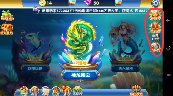 4.游戏界面的右上角有VIP特权、兑话费和兑换码