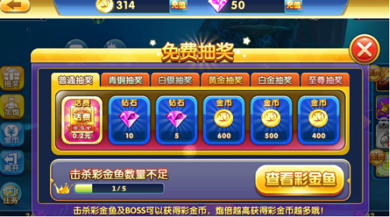 (抽奖指在游戏里击杀彩金鱼达到了一定的数量可以进行免费抽奖,抽奖一次包括普通、青铜、白银、黄金、白金、和至尊抽奖,如果从低级抽奖达到了规定彩金鱼没有进行抽奖的话,可以累积到相邻高一点的抽奖里面,