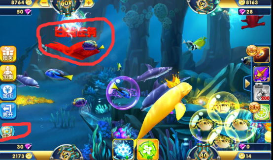10打中彩金鱼都会自动累计到左边的抽奖里面,打中游戏里的日常任务都会显示在左下角,然后完成任务就会得到相应的奖励,