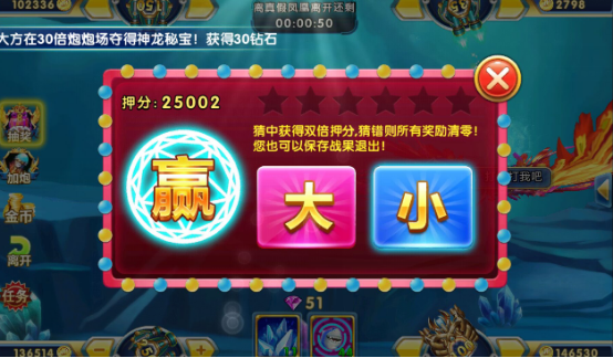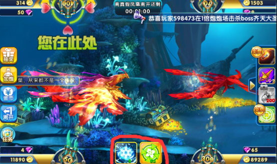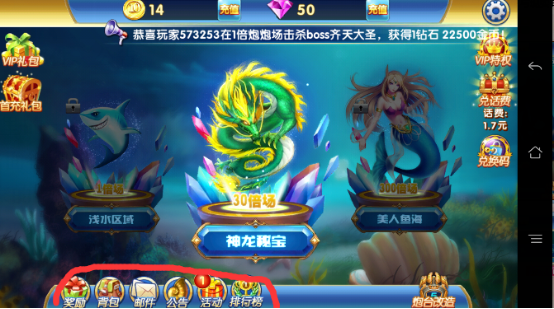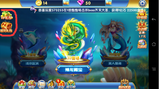 7.在游戏倍场里的左边有抽奖、加炮、金币和离开的功能