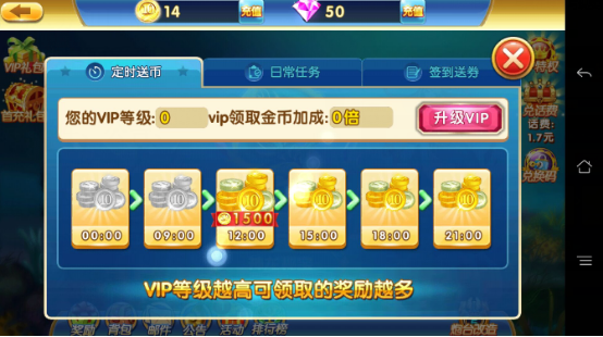 (VIP特权的主要功效是玩家可以在提示界面累计充值达到了一定的额数可以升级VIP,然后可以解锁VIP相应的炮台,高级VIP可同时享受低级特权,VIP等级越高每天领到的免费金币就越多,兑话费指玩家话费达到了一定的数量就可以在里面兑换珊瑚、钻石、金币和流量,前提是必须绑定手机号码,兑换码现在还暂未开放)