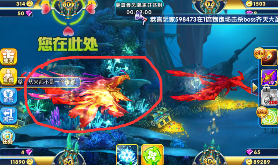 11.游戏里时不时会出现恶魔宝箱、李逵、孙悟空和美人鱼,打中恶魔宝箱会给相应的钻石,打中李逵、孙悟空和美人鱼给的都是大量的金币,在捕获李逵、孙悟空和美人鱼时尽量把炮倍调高一点这样命中率比较高一些