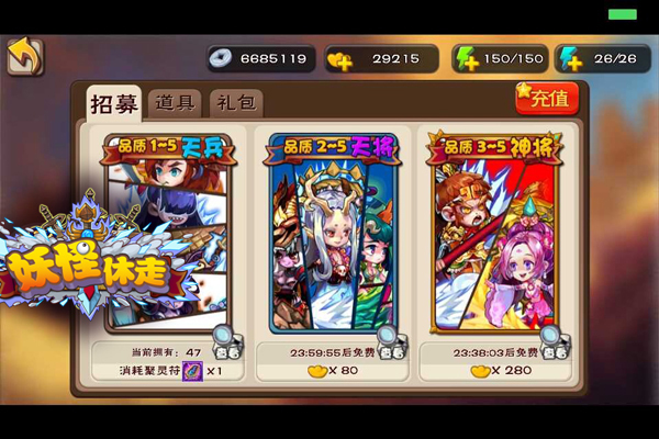 商城招募有三种招募方式,一种是成本最低的,通过消耗聚灵符来招募。这种方式所能招募到的卡牌可以说没有太大的品质保证,在1星至5星之间,想要抽到橙卡需要人品非常好才行。而聚灵符在游戏中有很多种获取方式,比如签到等等。
