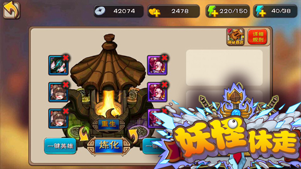 2.装备装备是这个游戏至关重要的一点之一,拥有好的装备才能跟高的提升英雄的能力。紫装对于各项能力的提升都是质的变化,但除了首冲赠送的鸣鸿刀,其他紫色装备的获取真心不容易。因此我建议非R或是小R收集成套的绿装、蓝装比较适合初中期发展。游戏中获得蓝色套装的地方不少,凑齐也不是难事,而且蓝色套装给英雄带来提升可是非常巨大的。3.炼妖炉如果已经确定了你自己的路线,那就可以把没用的英雄炼化了,得到的魂玉在神秘商店购买你想要的英雄或者英雄元神。炼妖炉中获得的洗髓丹是前期大家比较容易忽略的,初期我们不可能凑齐想要的英雄,在确定了长期路线并获得所需英雄后,可使用洗髓丹为你的英雄进行升星,这能大幅提升你的英雄的实力并获取无双技。