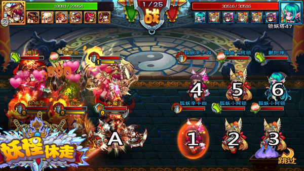 A是十字攻击(当英雄攻击主目标时,主目标所在的排和列也会受到攻击。)英雄的情况:当A英雄攻击1号位时,会同时攻击2、3、4号位。当A英雄攻击3号位时,会同时攻击1、2、6号位。A是全体攻击英雄的情况:A英雄会同时攻击1、2、3、4、5、6号位的对手。A是随机攻击英雄的情况:A英雄会随机选择目标进行攻击,随机对手的数目根据英雄的不同会有1~5个。《妖怪休走》中除了多样化的攻击模式,还有不少辅助英雄——拥有加血技能的英雄、加怒气值的英雄、可复活队友的英雄。加血技能英雄:加血的时候,A英雄会优先选择场上英雄百分比血量最少的加,若场上受伤英雄(比如2个)少于技能加血数量(比如3个),则按照数量随机给满血英雄(1个)加血。加怒技能英雄:加怒气的时候,A英雄会优先选择场上怒气值最低的英雄,若有多个怒气值相等的英雄,则按照站位数字小的加怒气,若场上无可加怒气的英雄存在,则进行普通攻击复活技能英雄:施放复活技能的时候,A英雄会优先选择场上已经死亡的队友,若有多个死亡的队友,则按照站位数字小的复活,复活的时候恢复该队友一定量的生命值;若场上无死亡队友,则按照英雄百分比血量最少的英雄加一定量的生命值