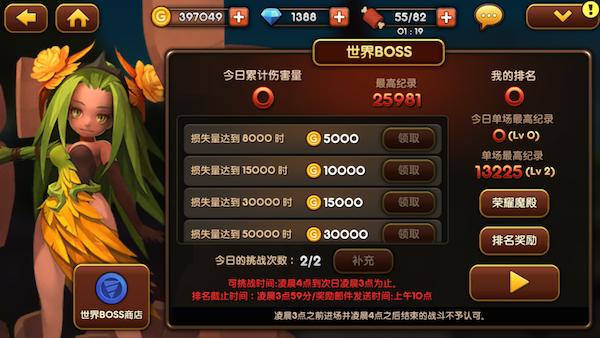 世界BOSS是个非常重要的副本,玩家可以通过每天的战斗获得大量金币,世界boss硬币,以及排行榜的钻石奖励,完成每日两次挑战还有日常奖励。