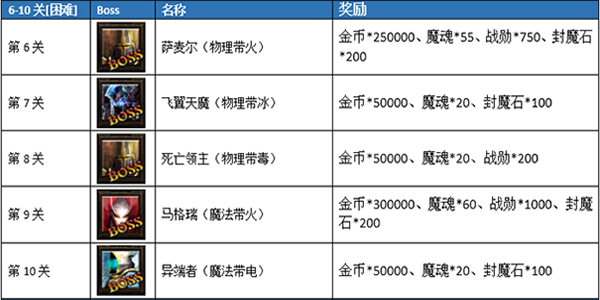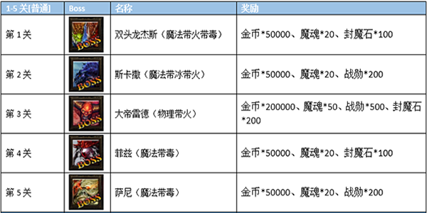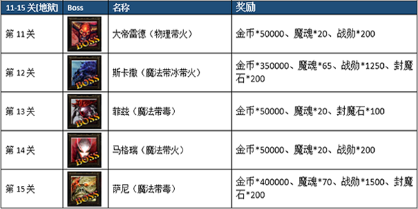 勇闯炼狱40级开放,一共有15关,每通过一关可以开启一个宝箱,宝箱分银色与金色,金色宝箱奖励更加丰富;关卡越高,难度越高Boss也越强;建议搭配至少2个治疗型英雄和一个MT,其中第2、5、12、15关..
