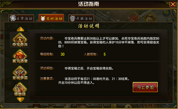 活动时间为每天晚上21:00-21:30,活动开始10分钟后不能再进入夺宝地图。