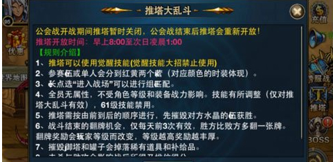 参赛的玩家在该系统中,战斗属性将全部统一重置,所有职业也禁止使用61级的大招技能,进入点击“推塔”按钮,即可进入匹配。