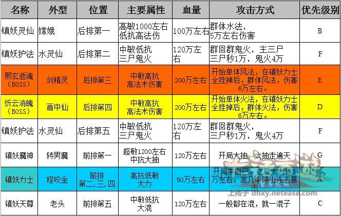 怪物阵容:标配10个怪,BOSS忻云消魄(火法画中仙)、BOSS熙玄逝魂(风法剑)、三个镇妖力土(大力)、镇妖魔神(加速男魔)、镇妖天尊(放混老头)、镇妖灵仙(群水嫦娥)、镇妖护法(回血水灵)