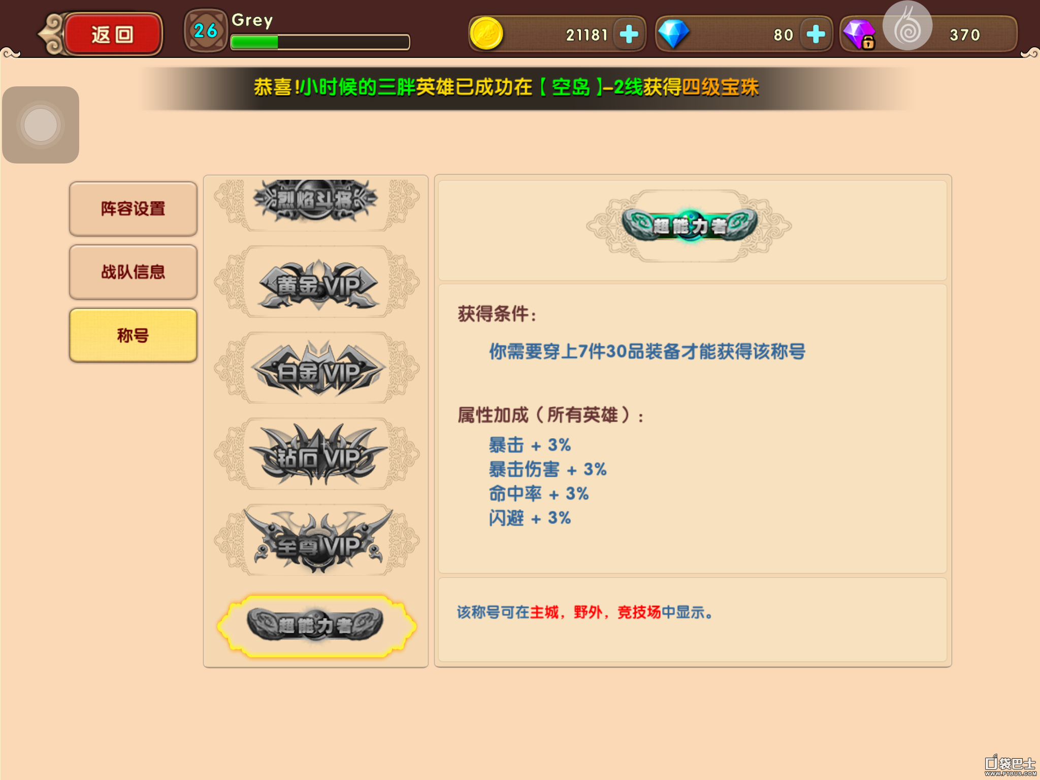 目前已有很多玩家都完成了这个成就并且机会了所向披靡称号,这个称号也是此次版本属性最好的称号之一,伤害加300,爆伤加15%,很不错的,非常适合输出流玩家。