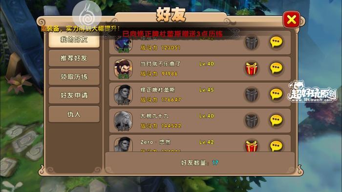 添加好友之后,可以通过好友之间互相赠送历练。玩家平时可要多条件好友哦,在主城野外可见的好友都可以点击添加好友,另外在各种排行榜中也可以添加好友。