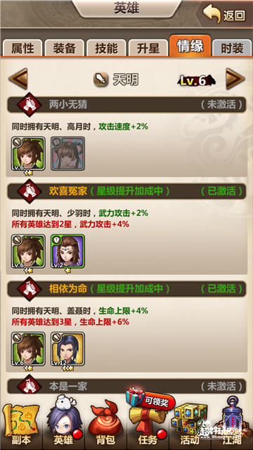 情缘相对来说难度有些大,全部凑齐的话需要一个很长的周期,建议玩家首先凑齐一些情缘比较简单的,例如2-3个英雄就可以激活的。终极情缘一般多达10个英雄及以上。