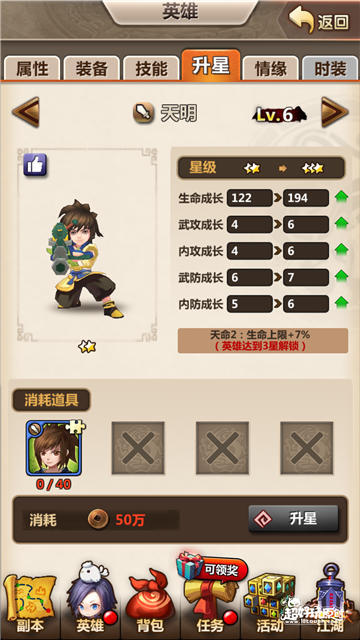 通过学习天赋可以对英雄进阶升星,一共有4个天赋密码,天赋密码可以通过副本扫荡或者通关得到。集齐4个之后,选择进阶就能提升英雄品质。
