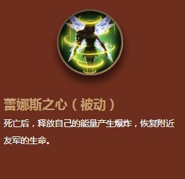被动技能(蕾娜斯之心):死亡后,释放自己的能量产生爆炸,恢复附近友军的生命。