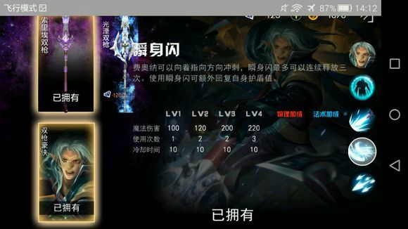 技能二:瞬身闪:费奥纳可以向着指向方向冲刺,瞬身闪最多可以释放三次。使用瞬身闪可额外回复自身护盾值。