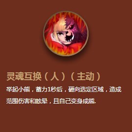【主动-灵魂互换】:举起小熊,一秒后砸向选定区域,造成范围伤害和眩晕,且自己变身成熊