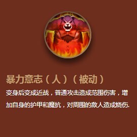 【被动-暴力意志】:变身后变成近战,普通攻击造成范围伤害,增加自身护甲和魔抗,对周围的敌人造成烧伤。
