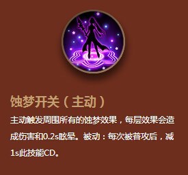 主动技能(蚀梦开关):主动触发周围所有的蚀梦效果,每层效果会造成伤害和0.2s眩晕。被动:每次被普攻后,减1s此技能CD。