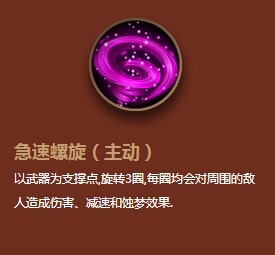 主动技能(急速螺旋):以武器为支撑点,旋转3圈,每圈均会对周围的敌人造成伤害、减速和蚀梦效果.