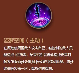 主动技能(盗梦空间):在原地使周围敌人攻击自己,被控制的敌人只能造成1点伤害。结束后引发爆炸造成伤害且触发所有蚀梦效果,蚀梦效果只造成眩晕。盗梦师每被攻击一次,爆炸伤害提高。