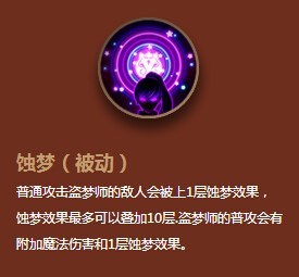 被动技能(蚀梦):普通攻击盗梦师的敌人会被上1层蚀梦效果,蚀梦效果最多可以叠加10层.盗梦师的普攻会有附加魔法伤害和1层蚀梦效果。