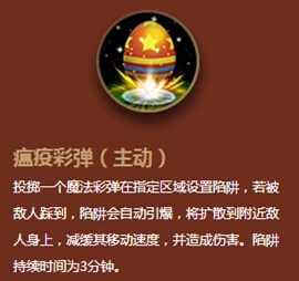 瘟疫彩蛋(主动技能):投掷一个储存的彩弹来设置陷阱,如果被敌人踩到,陷阱会引爆,将毒散发到附近的敌人身上,减缓他们的移动速度,并造成魔法伤害,且会持续一段时间。陷阱持续时间为3分钟。