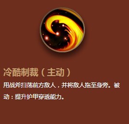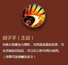 刽子手:阿道夫向目标英雄发动跳劈,对其造成真实伤害,每层出血效果将受到20%额外伤害。当技能击杀掉目标后,清除技能冷却时间。