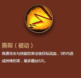 撕裂(被动):基础攻击和伤害技能为目标附加出血效果,每秒内造成额外的魔法伤害,撕裂效果最多叠加5次。每个带有出血效果的敌方英雄都将提升阿道夫5%的移动速度。