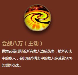 会战八方:阿道夫挥舞武器对附近所有敌人造成物理伤害,被斧刃击中的敌人会比被斧柄击中的敌人多受到50%的额外伤害;阿道夫下次普通攻击会造成额外伤害和减缓目标攻击速度和移动速度。