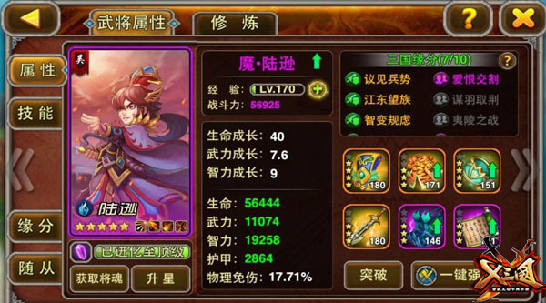 陆逊是东吴继周瑜、鲁肃、吕蒙之后的又一个功绩卓著的将领。智勇兼备,武能安邦,文能治国,声誉相当高,也正因为他才华横溢,所以在《X三国》中被设定为物魔双修型武将!而主公们都知道双修武将,前期都有那么点小缺憾,后期又非常耗费资源,小R和平民玩家只能望而却步。