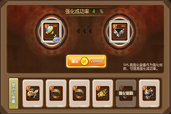 进入强化界面后,我们发现强化装备和被强化装备需为橙色才可以,也就是说S级以上的装备方具备强化条件。强化一件橙色装备需要另一件橙色装备,随着强化等级的提高,强化成功率也就越低。小编现在的武器是+5强化,再要强化到+6的成功率只有4%,但是小编注意到了一点,不知道守护者们有没有注意到了?那就是强化装备自己如果有强化等级的话,是可以提高强化成功率的,也就是说,小编现在+5的武器想要强化到+6,用一件+4的装备来强化,成功率会大大提升呦!