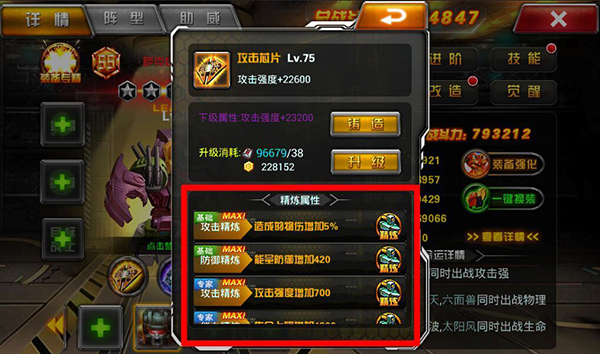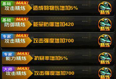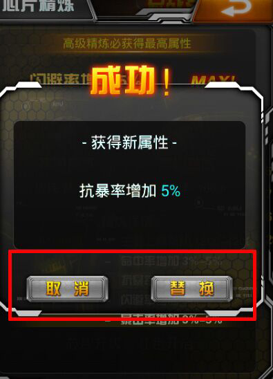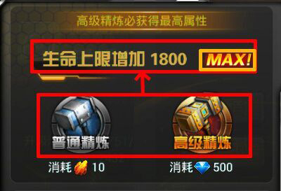 高级精炼更容易让精炼的属性最大化,当精炼的属性最大化的时候,将会出现MAX字样。芯片可以重复精炼,如果对精炼结果不是很满意可以点击取消(取消后,之前所消耗精炼石或者钻石不返还),得到满意的属性可以选择替换来保存并覆盖原来的属性。