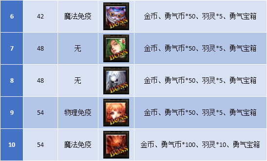 勇气之海30级可以进入,一共有20层,可上阵5位英雄。层数越高难度越大,每通过一层有机会获得勇气币、羽灵、勇气宝箱等奖励;勇气之海的怪物血量非常多,在不了解怪物的属性的情况下贸然行动会花费很多时间,小编历尽千辛万苦T T终于整理出勇气之海1-10层的怪物属性表,方便大家了解每个关卡的怪物,调整阵容与装备能助你轻松过关!只要达到三星,40级的时候就可以进行扫荡啰。