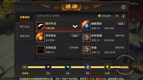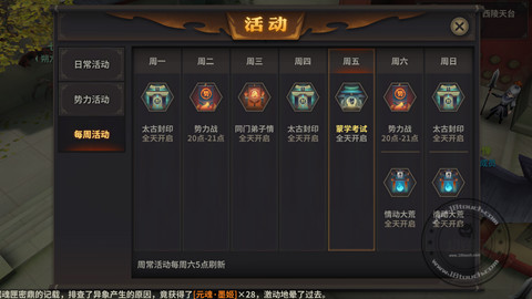 其中周二、周六的势力战、周四的蒙学考试、周六、周日的情动大荒可以获得大量的天选者经验,一定要记得参加。