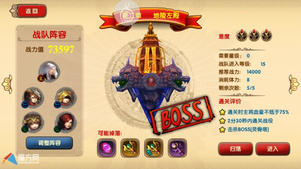 说真的地陵左殿这一关卡也是小编比较讨厌的副本,因为关卡的过关条件是有时间限制的,而副本中的小怪出现真的太慢了,而且远程攻击的小怪还不少,要全部清光真是浪费了小编不少的时间,但是这一关的BOSS说真的非常的好打,要是运气好了还能来一个秒杀的。