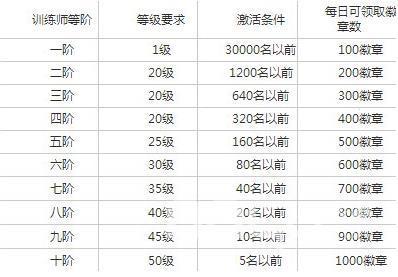 等级达到要求,并且在竞技中达到一定的排位时,可提升训练师等级称号,训练师等阶越高,每天登陆奖励中获得的徽章就更多。