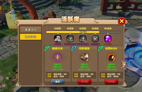 3、世界BOSS:每天参加1次世界BOSS可以获得10点活跃度,注:世界BOSS21:00-21:30开启