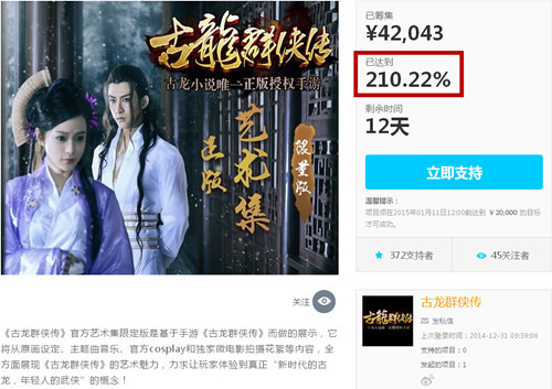 目前看来,手游《古龙群侠传》的众筹目标虽然早已达成,但玩家后续参与的热情却依旧高涨。截至2014年12月31日,众筹额度已经超过原计划的2倍,达到了210.22%。